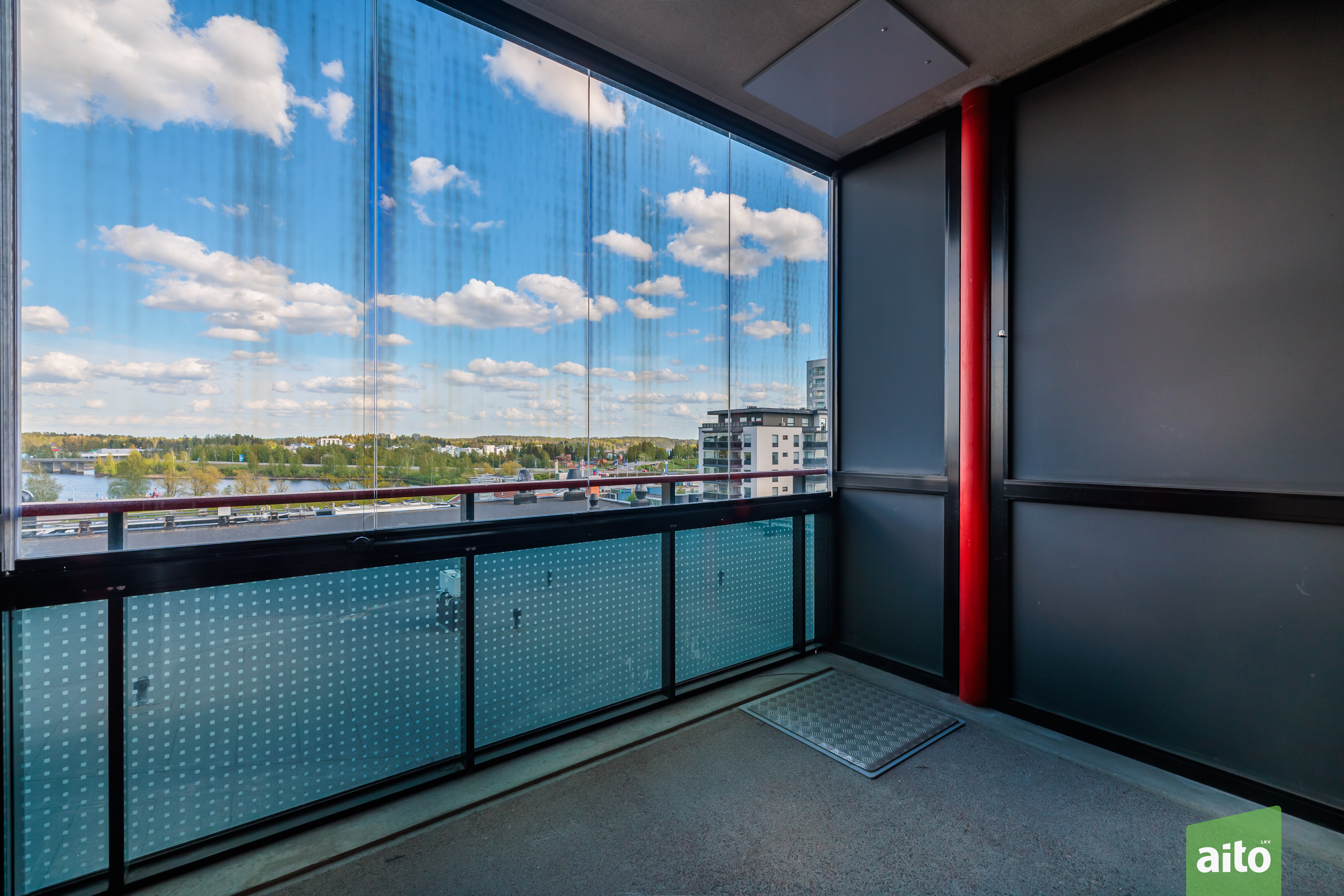 Lasitettu parveke, josta näkymä Satamanlahdelle.