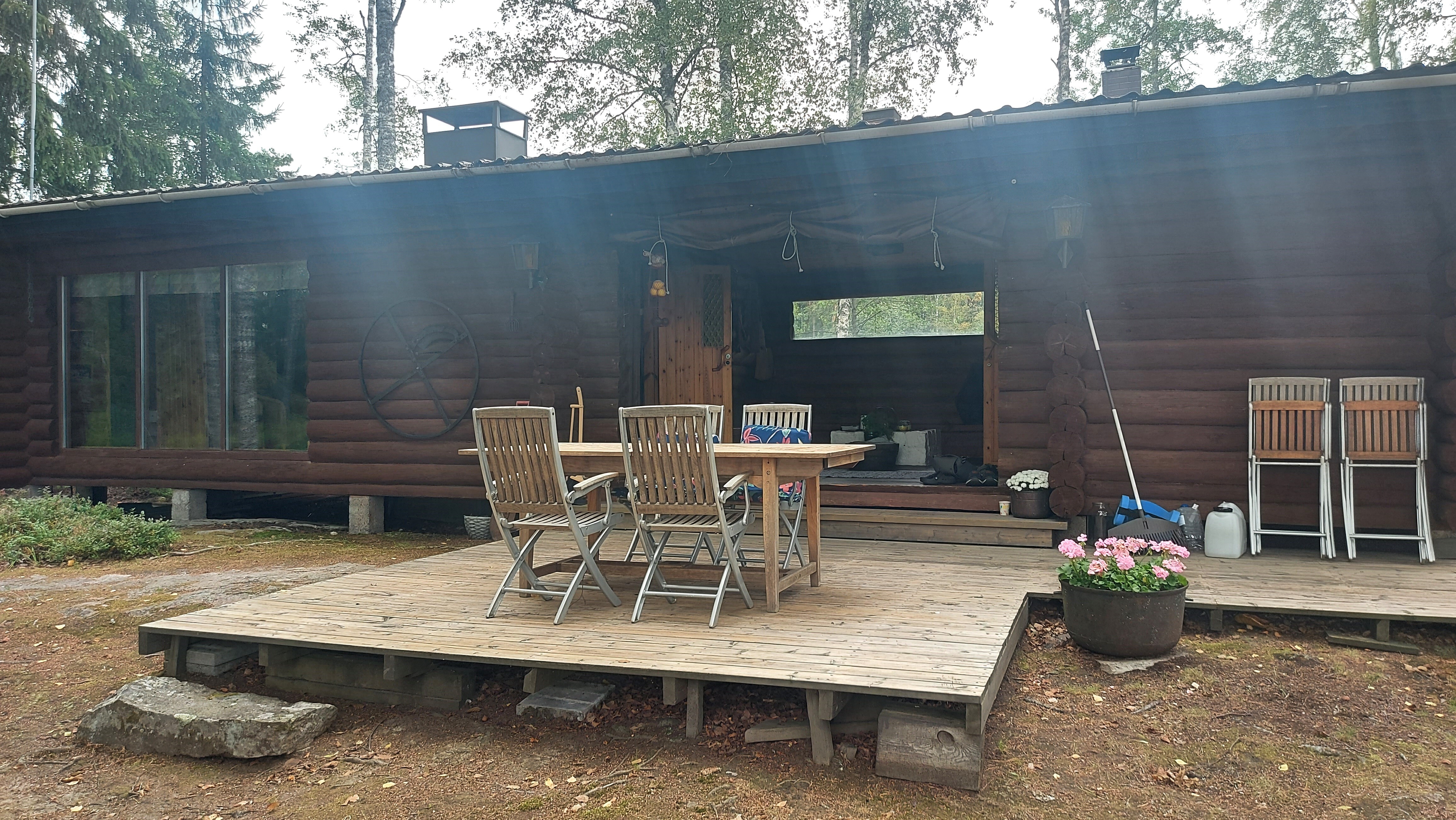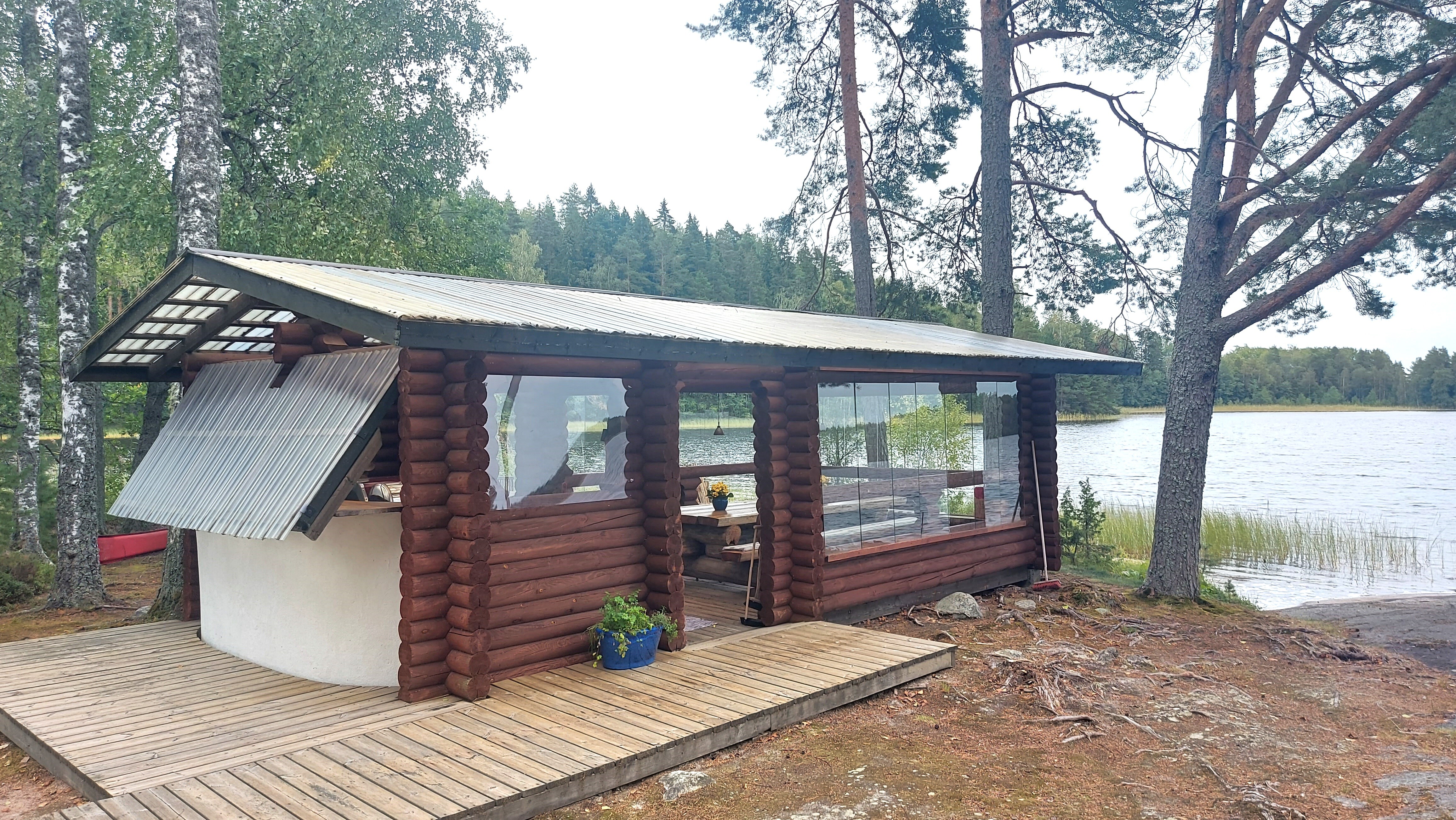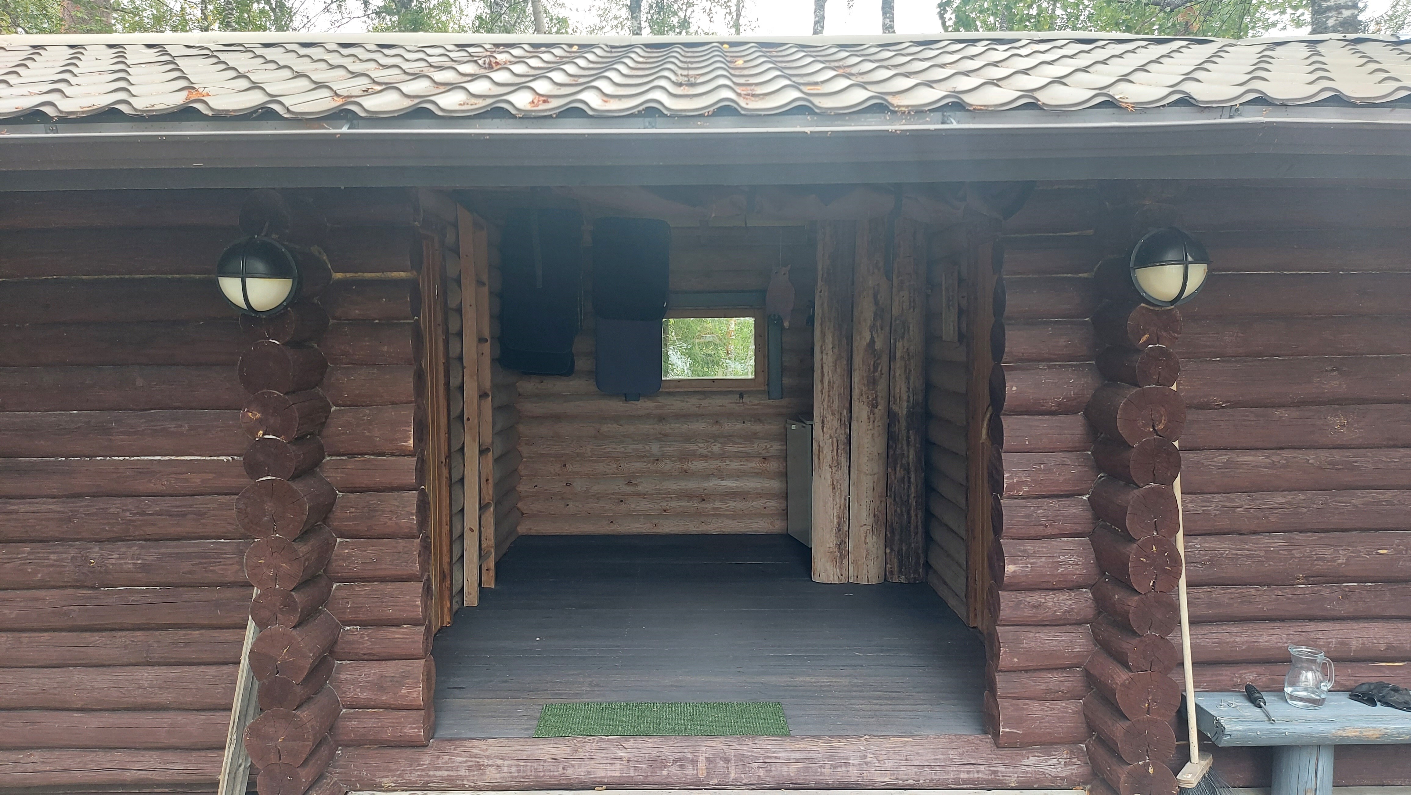 Aittarakennus: pyöröhirsinen, noin 36 m², jossa 2 erillistä makuutilaa ja keskellä veranta.