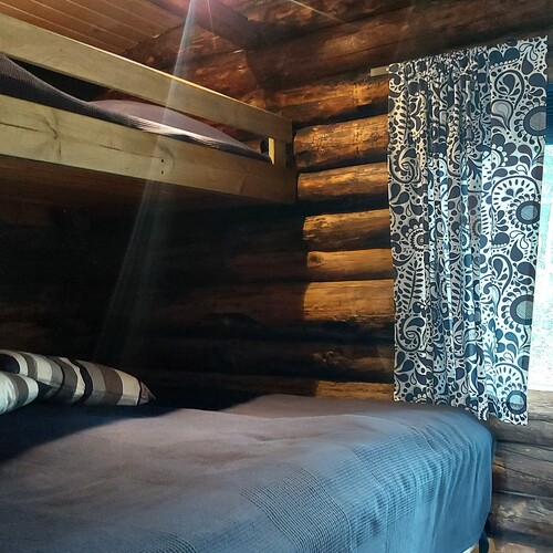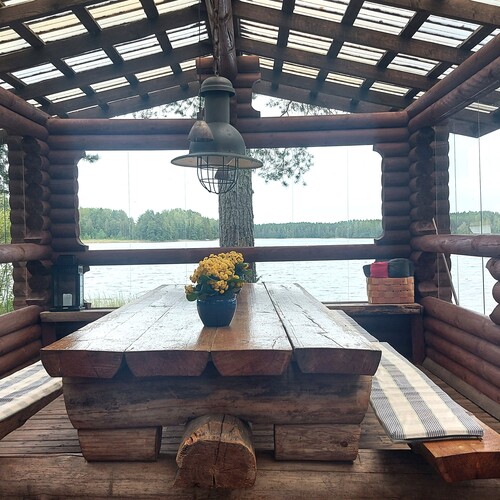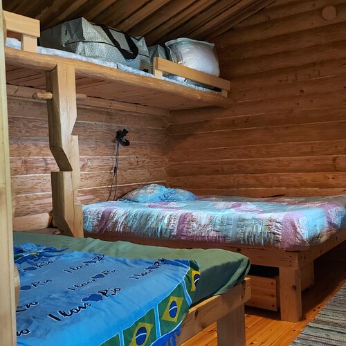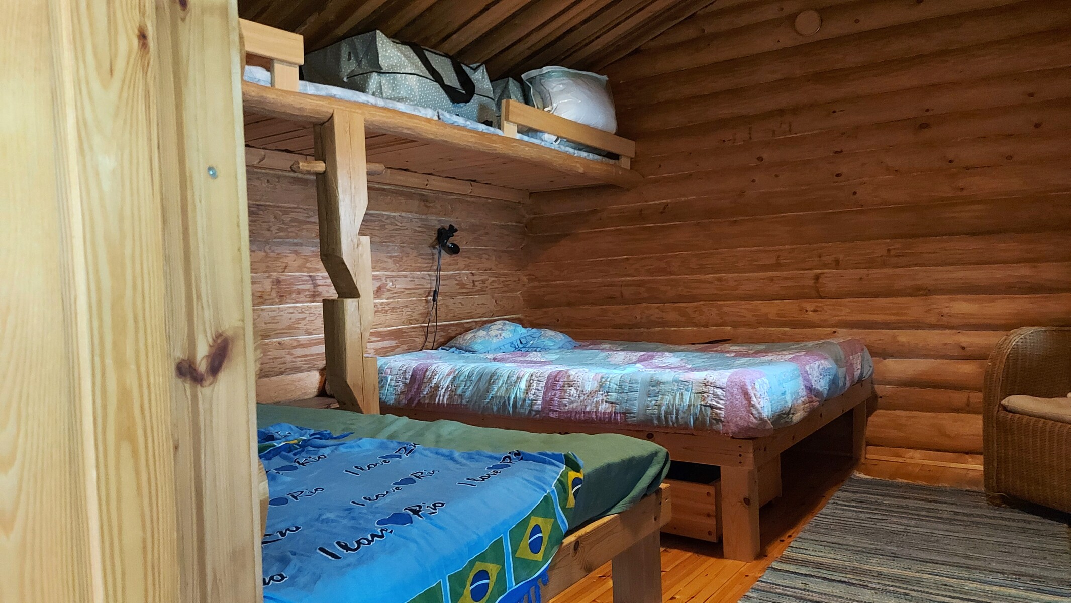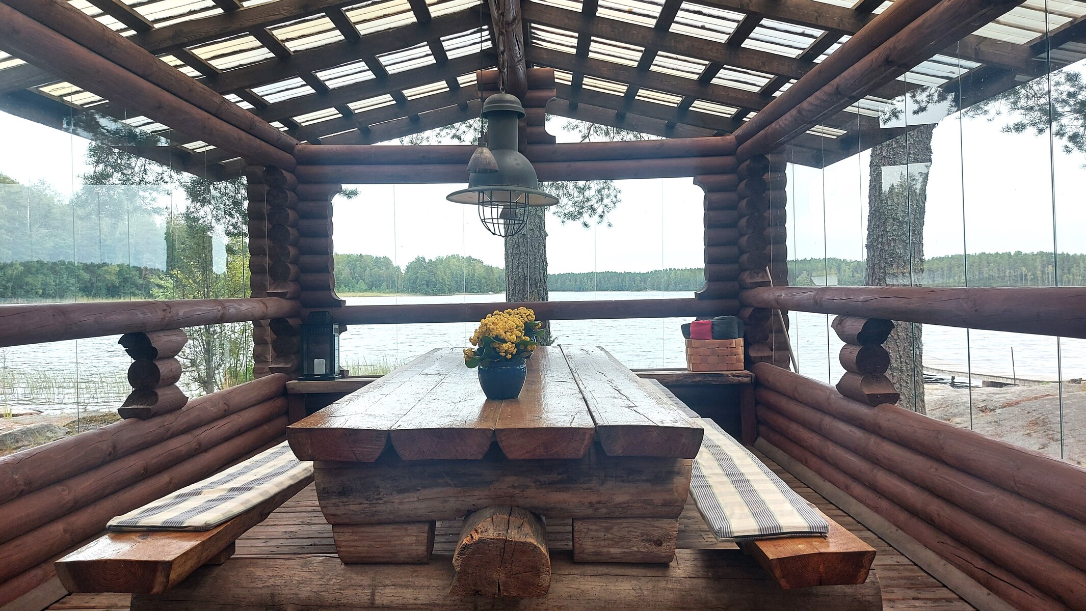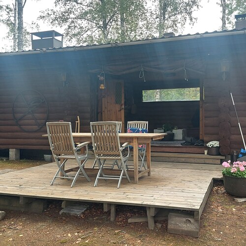 Aittarakennus: pyöröhirsinen, noin 36 m², jossa 2 erillistä makuutilaa ja keskellä veranta.
