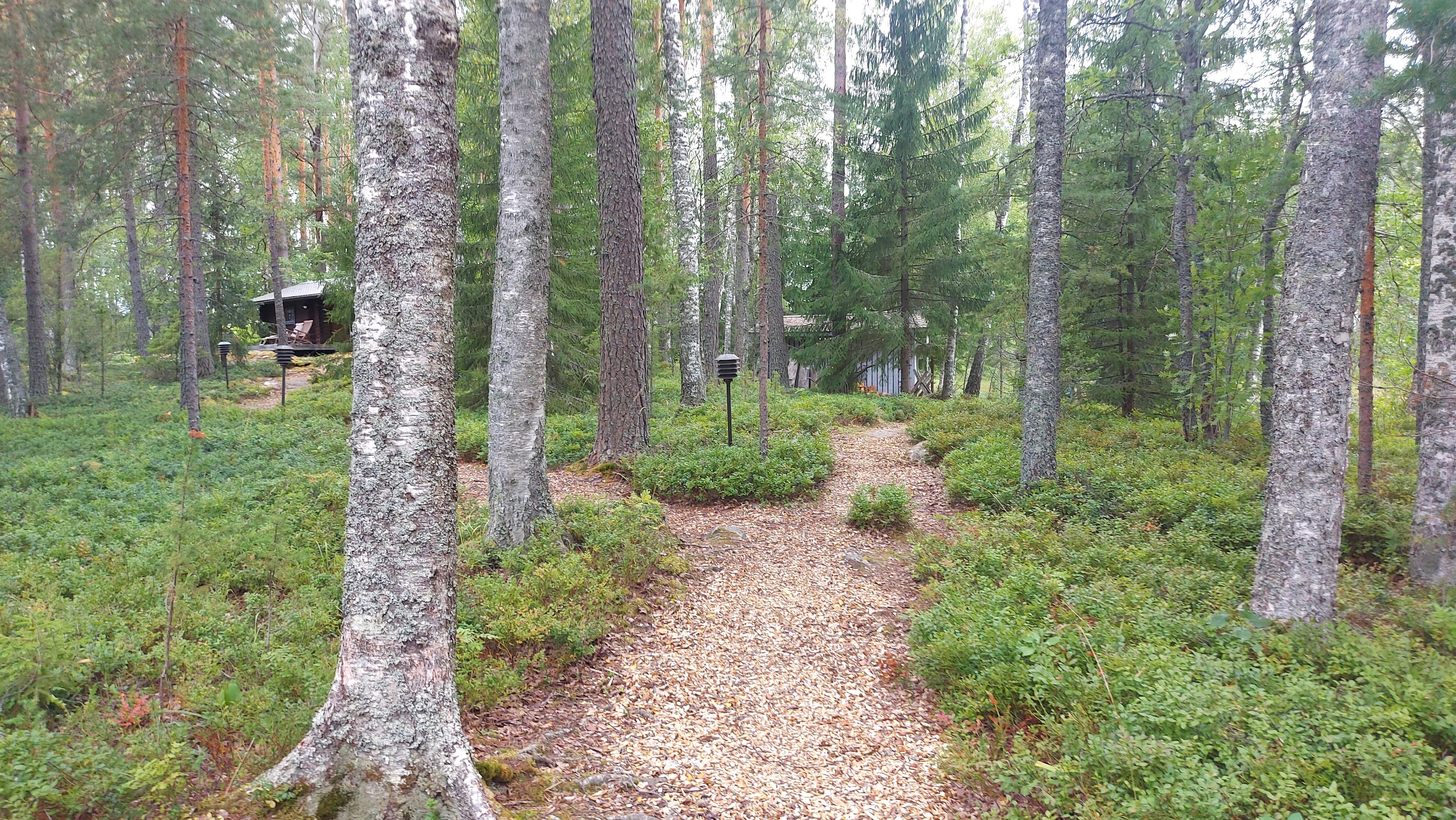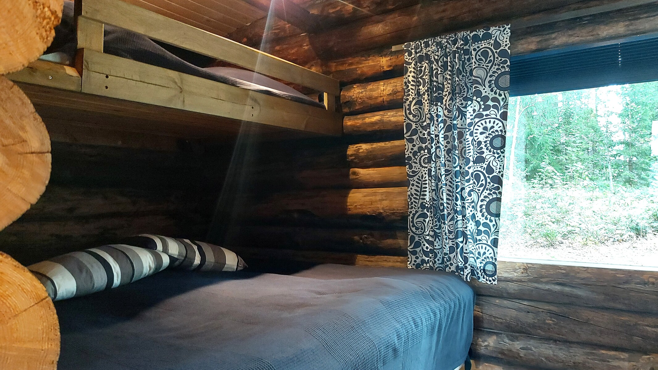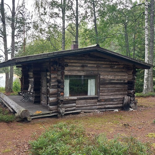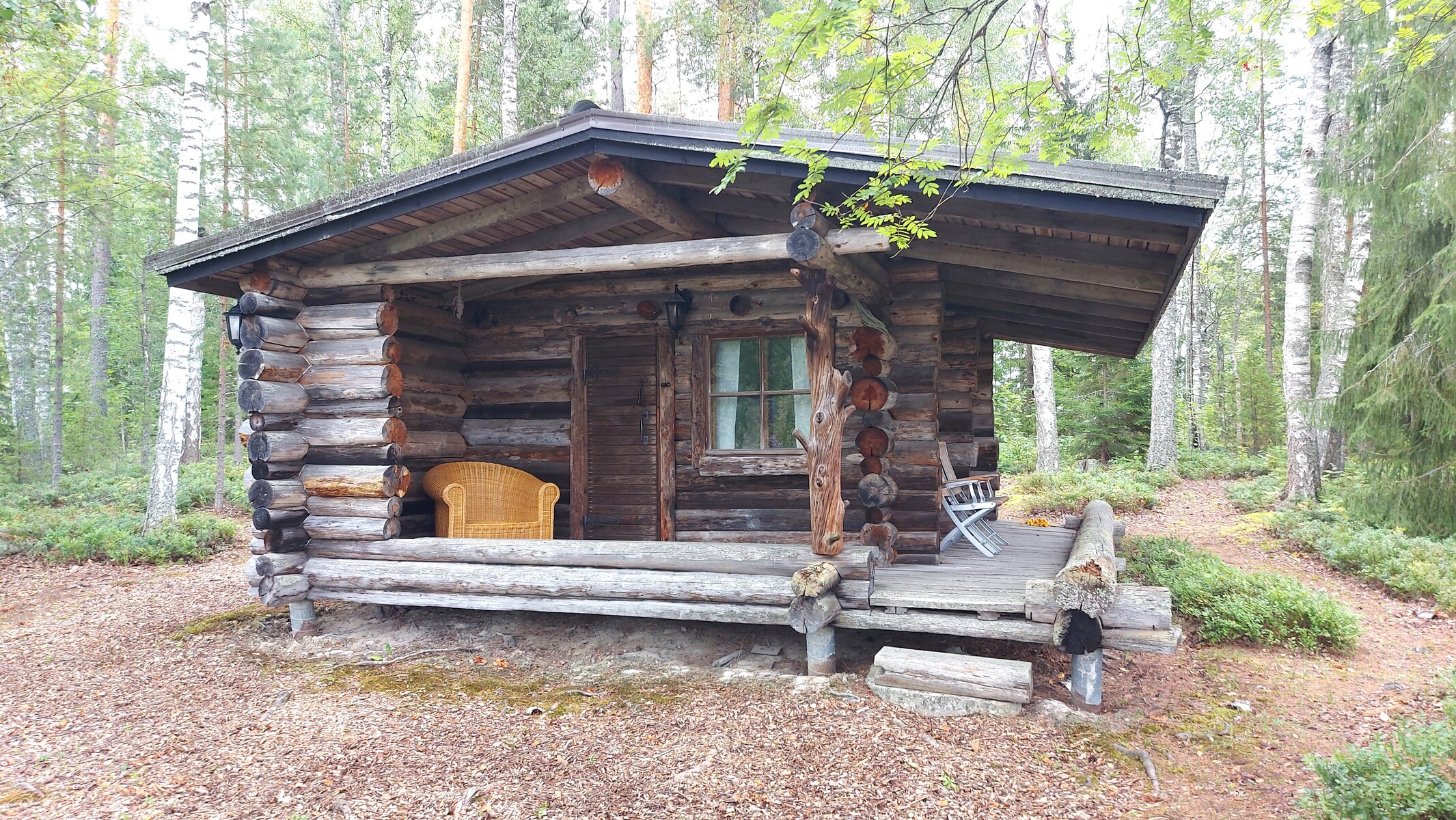 Päärakennus: pyöröhirsinen, noin 45 m², jossa tupakeittiö, 2 makuuhuonetta, veranta ja sauna.