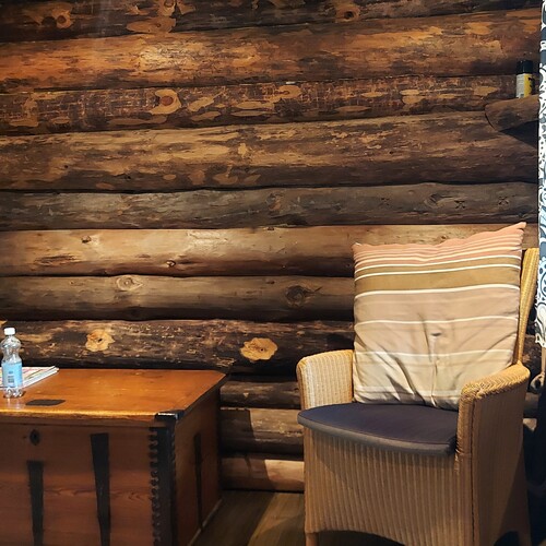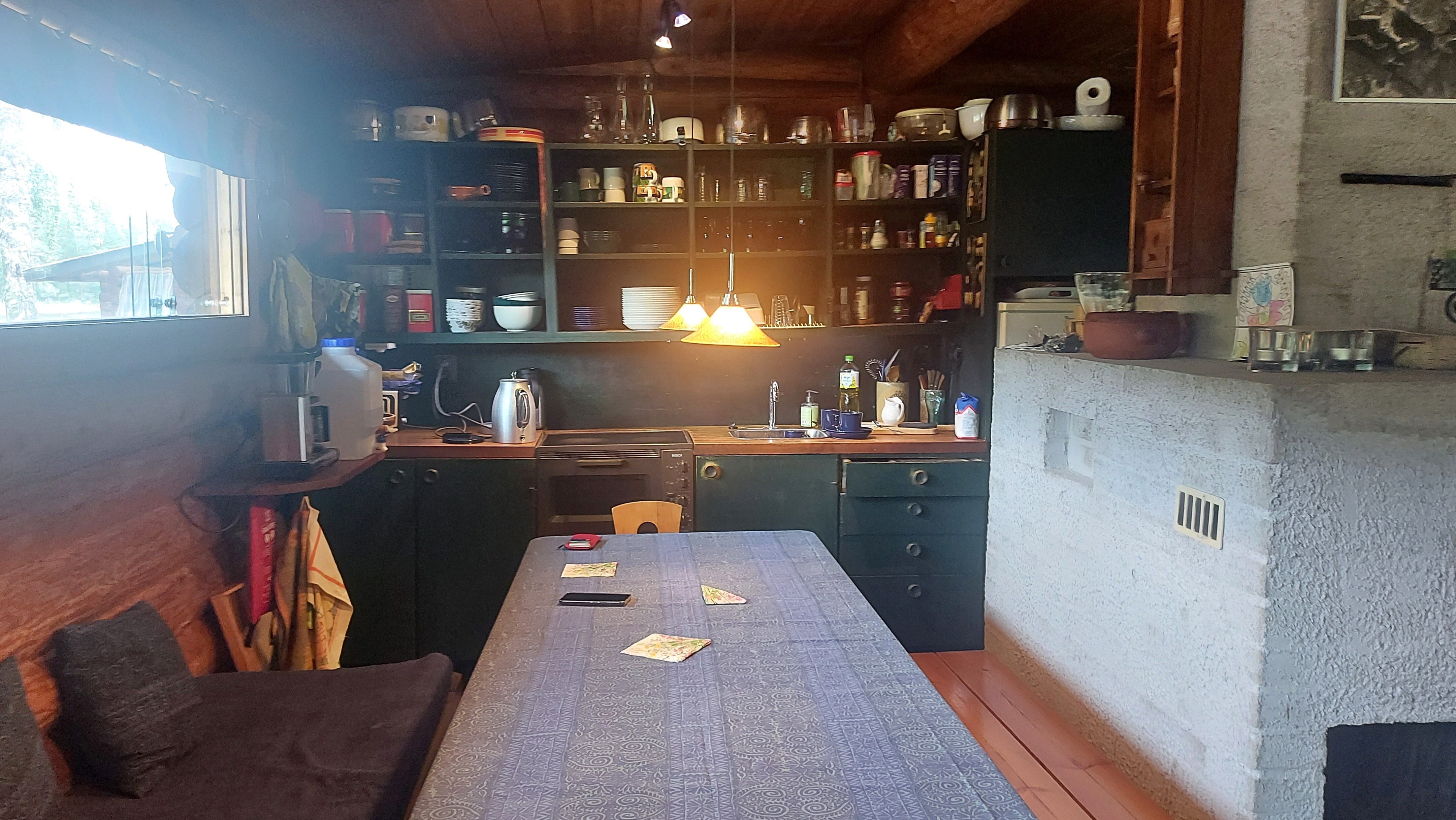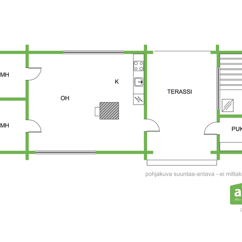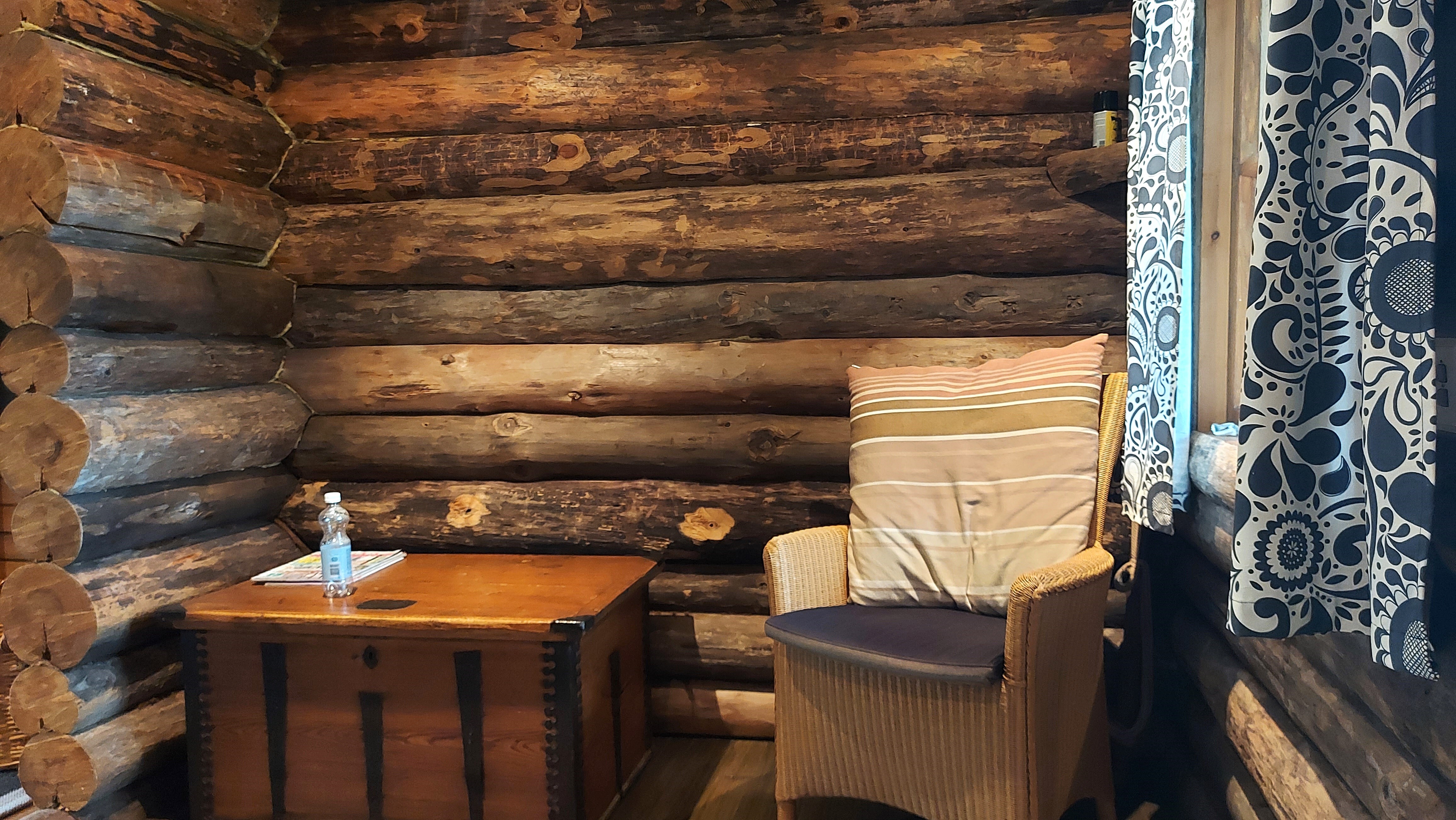 Päärakennus: pyöröhirsinen, noin 45 m², jossa tupakeittiö, 2 makuuhuonetta, veranta ja sauna.
