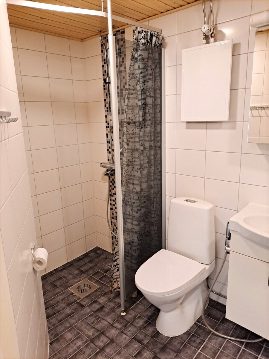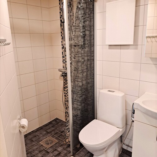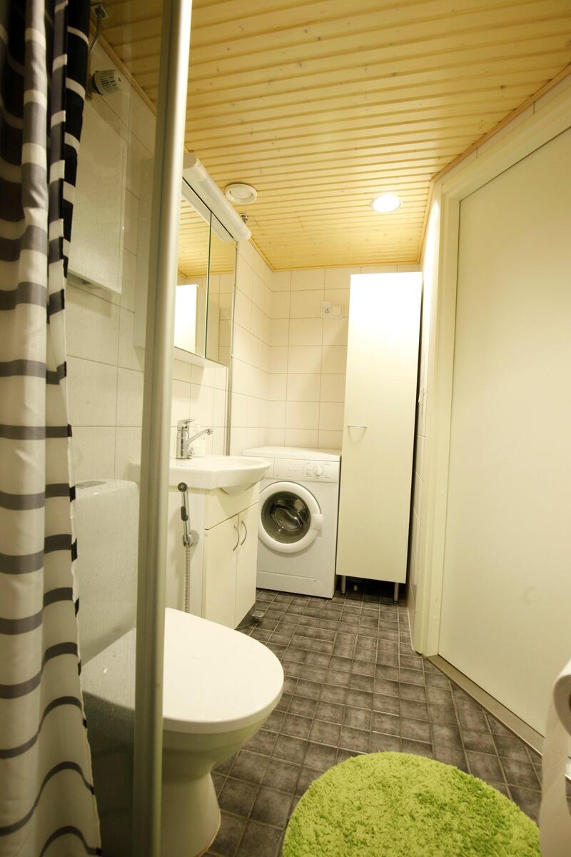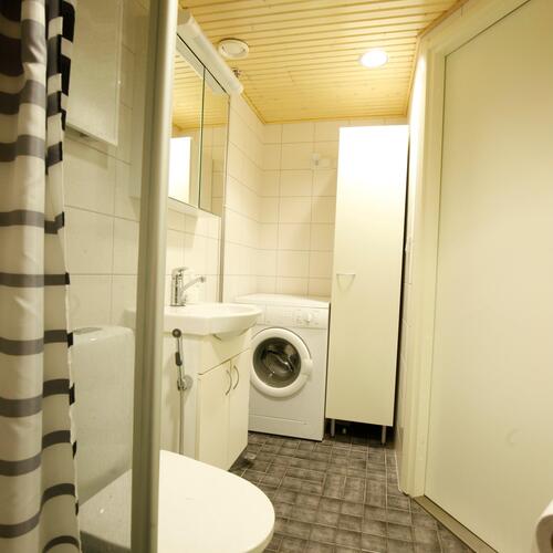 Varusteet: suihku, suihkuseinä, pesukoneliitäntä, pesukone, peilikaappi, allaskaappi