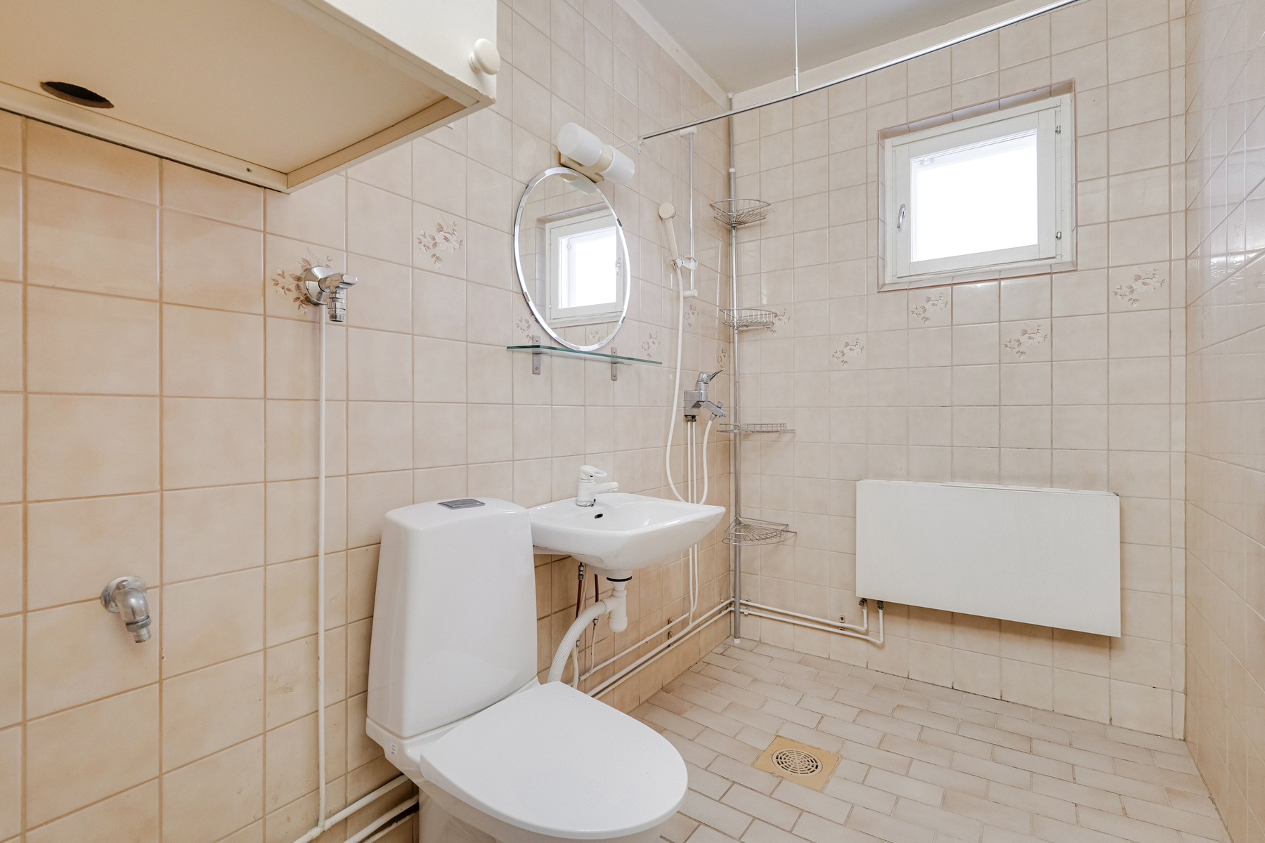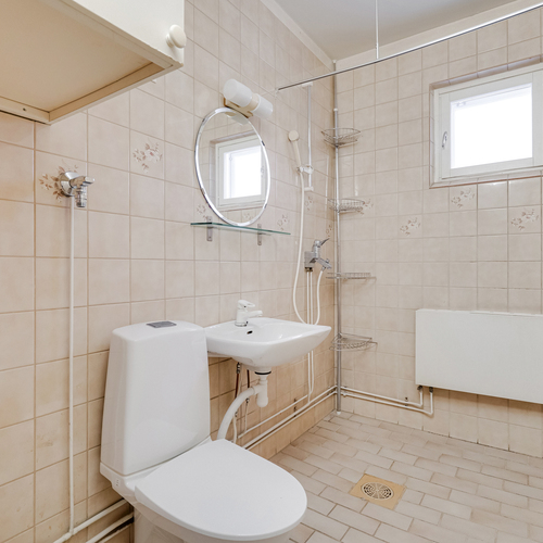 Varusteet: suihku, pesukoneliitäntä, peili