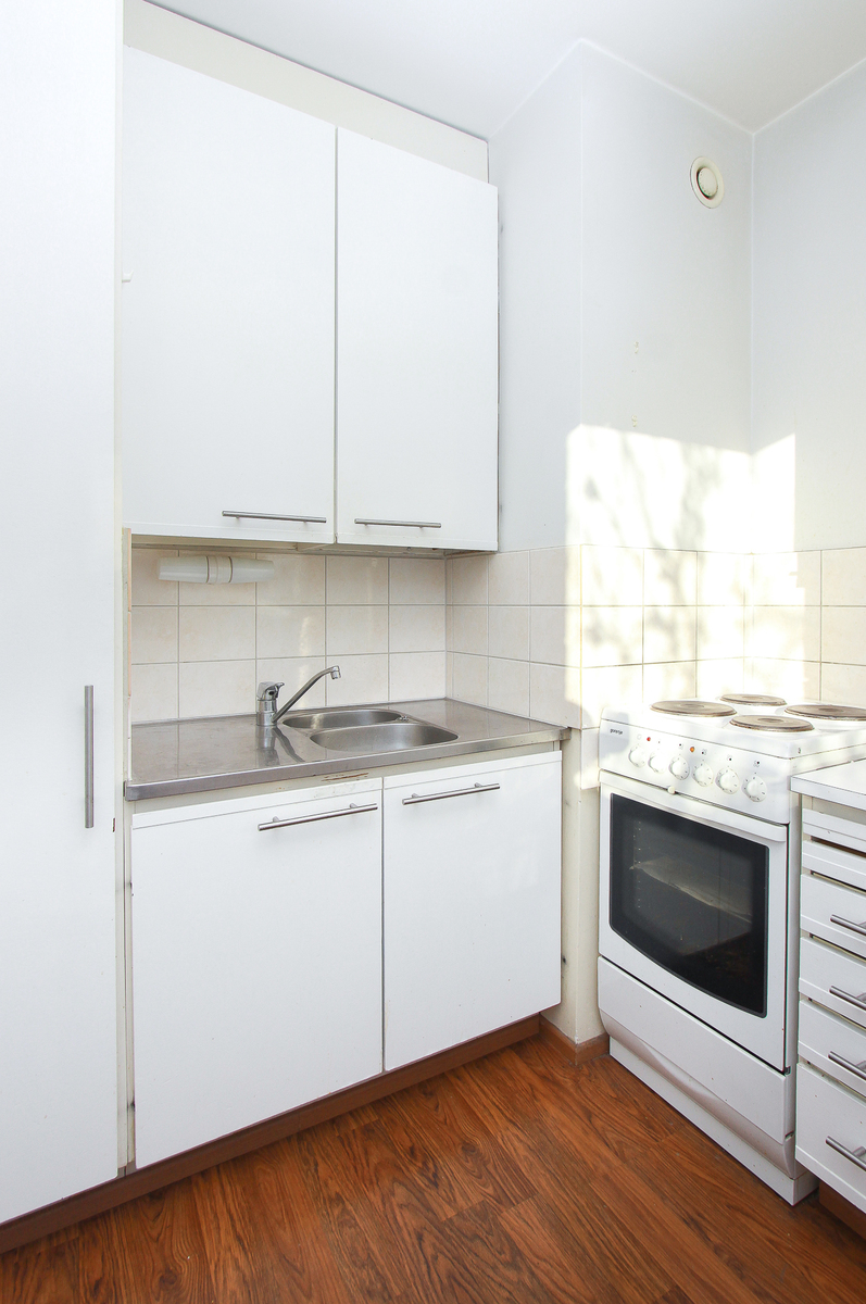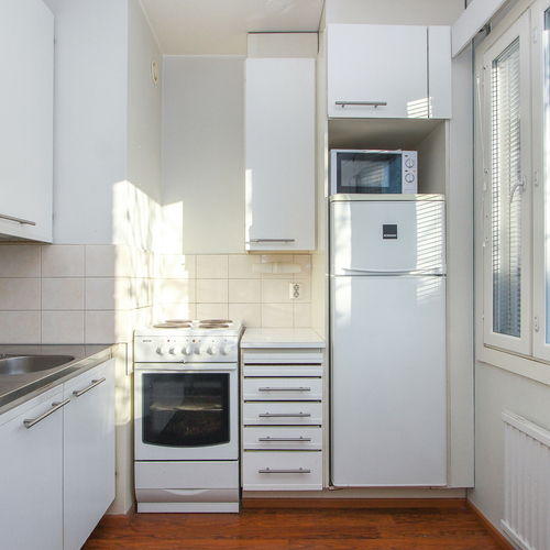 Vaaleat kaapistot. Jenkkikaappi, sähköliesi, kiinteät valaisimet. Lattia laminaattia, seinät maalattu.