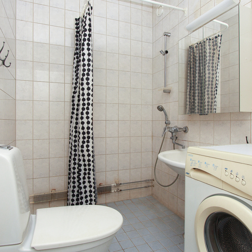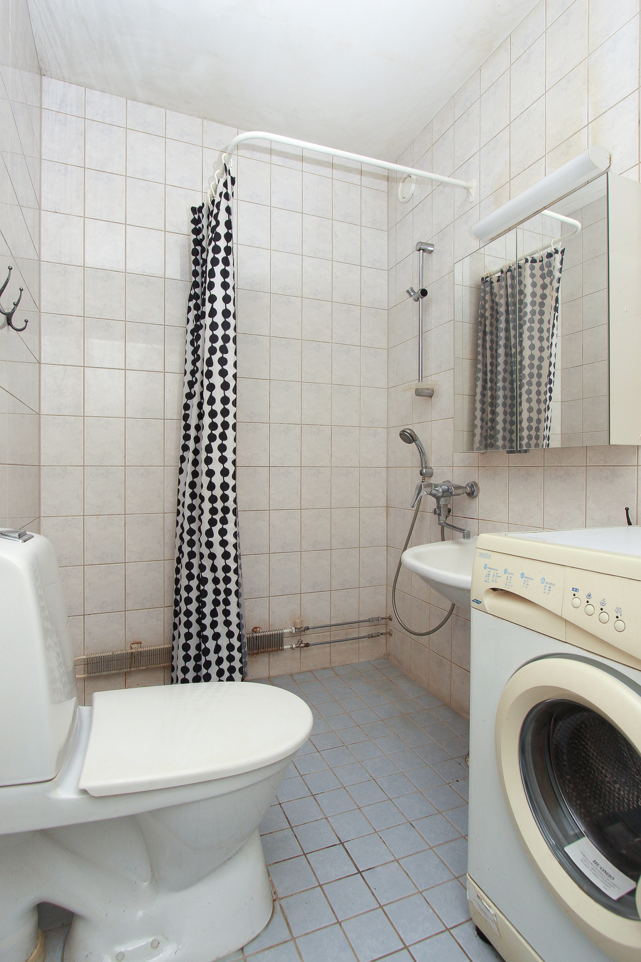 Laatoitettu kylpyhuone. Suihku, peili, pesukoneliitäntä, pesuallas, wc-istuin.