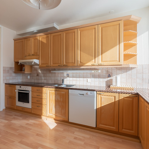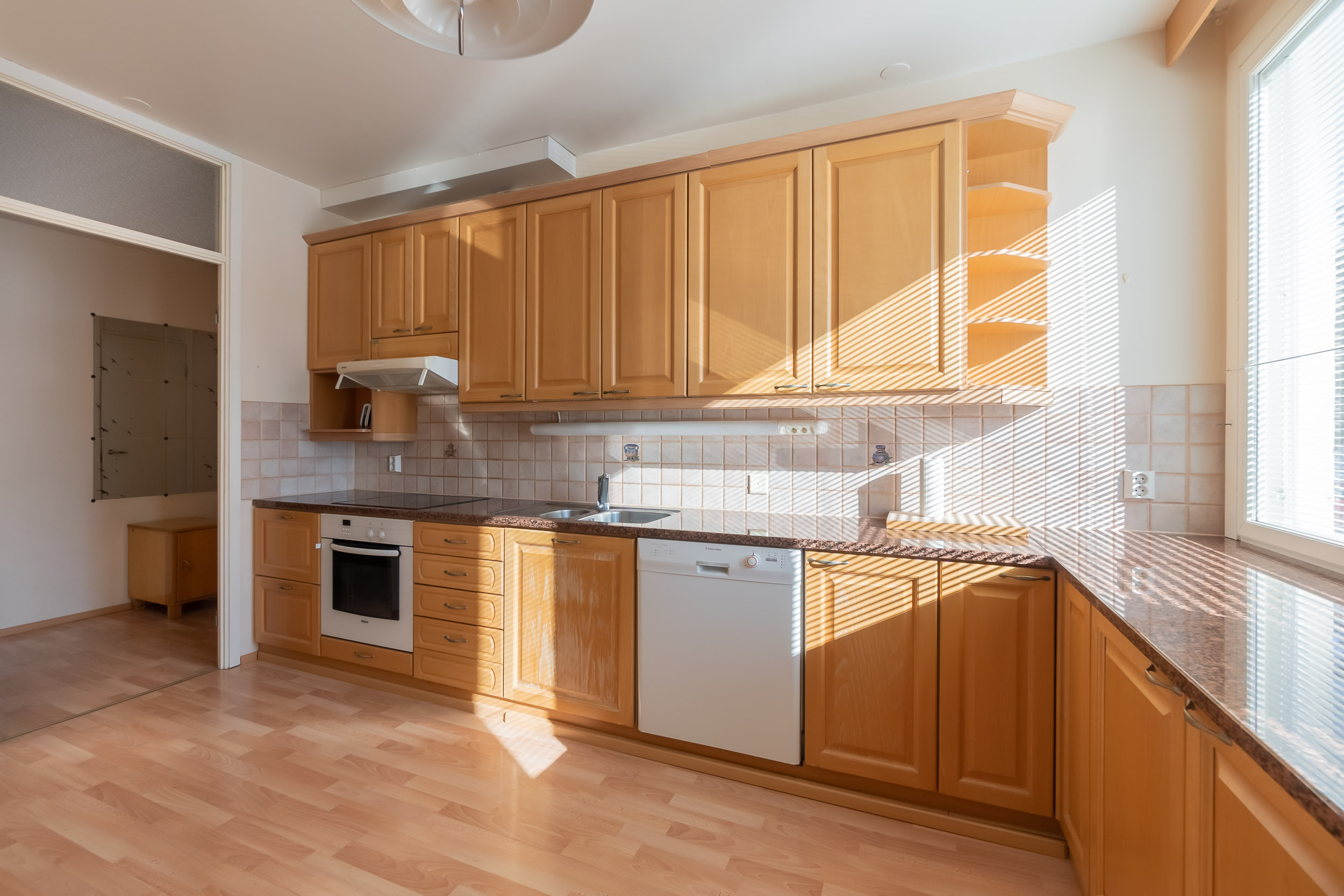 Keittiö on tilava ja toimiva – täällä kokkaaminen sujuu vaivattomasti. Kaapistoja on runsaasti, joten säilytystilaa riittää kaikille keittiötarvikkeille.