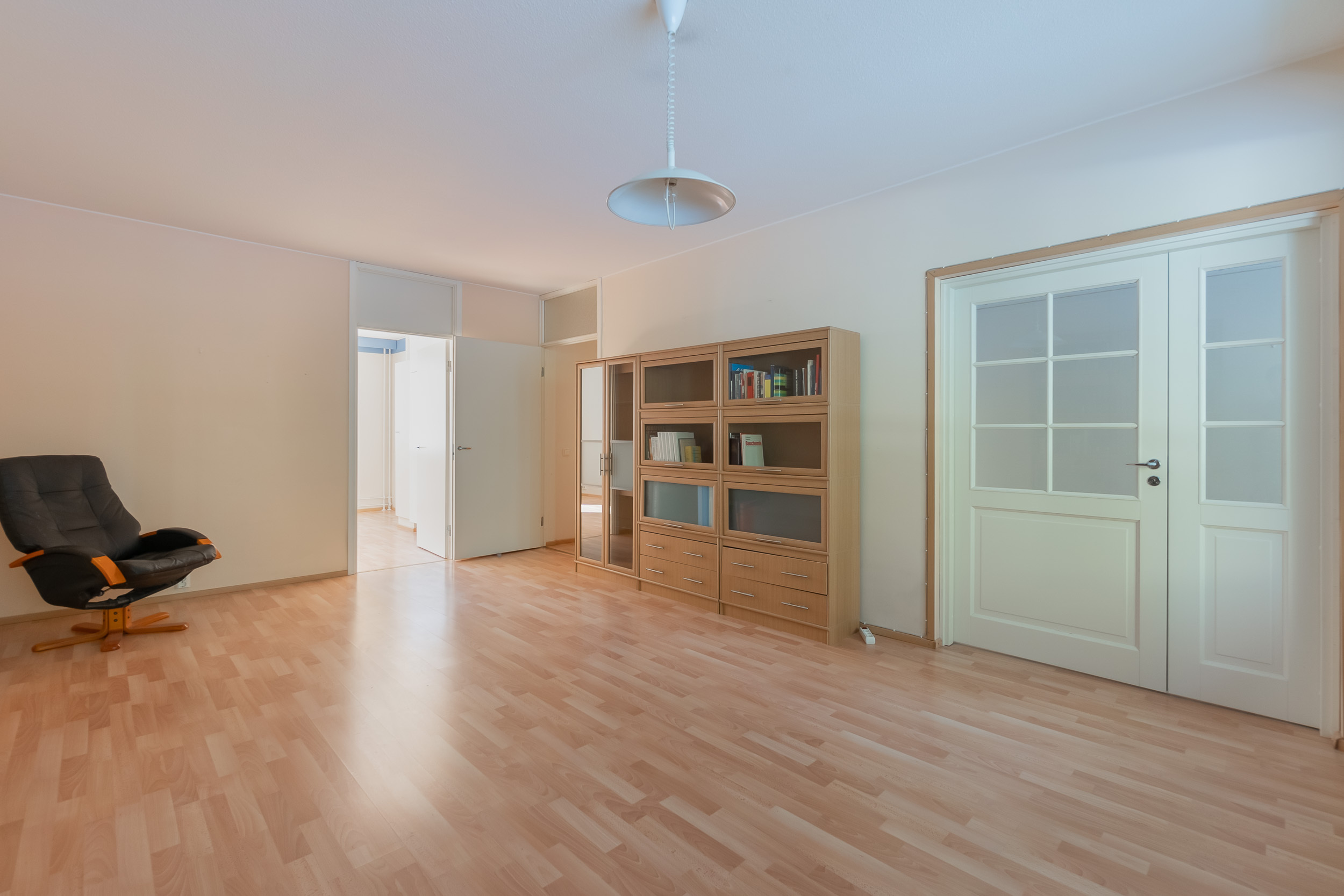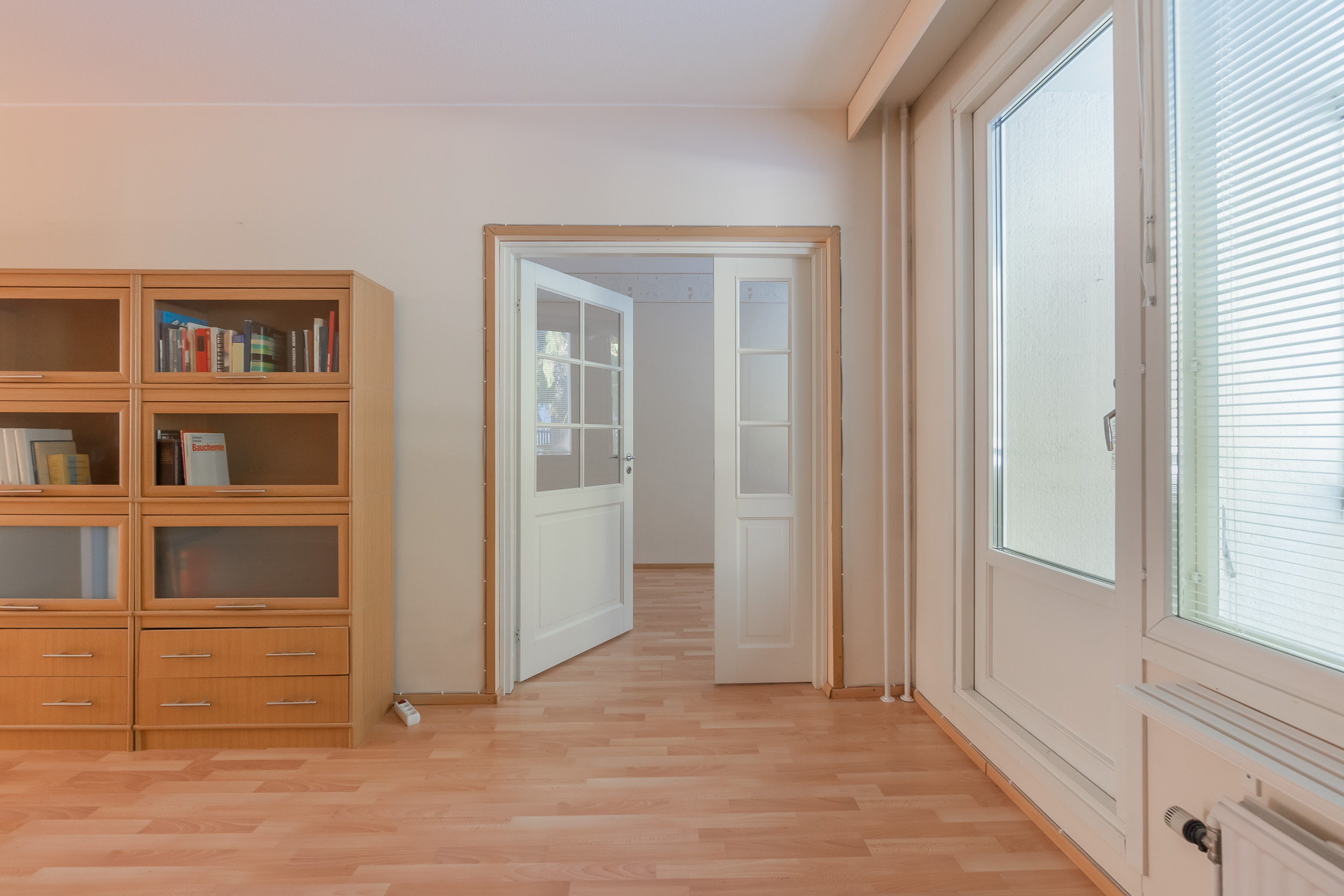 Valoisa ja avara olohuone tarjoaa tilaa sekä oleskeluun että ruokailuun. Olohuoneesta on käynti lasitetulle parvekkeelle, jossa voi nauttia rauhallisista hetkistä aikaisesta keväästä myöhäiseen syksyyn.