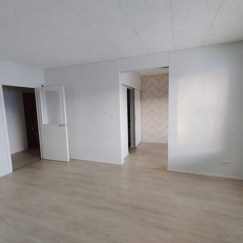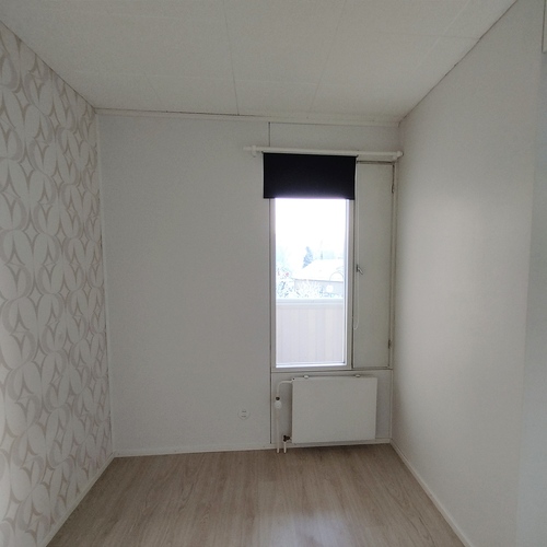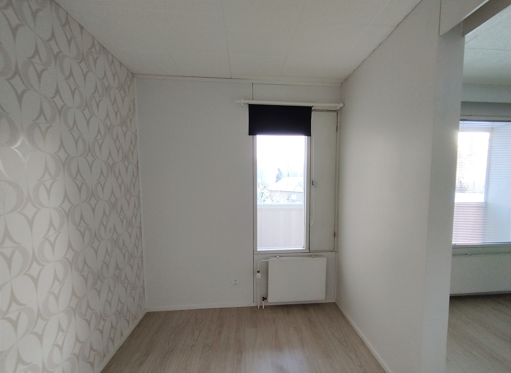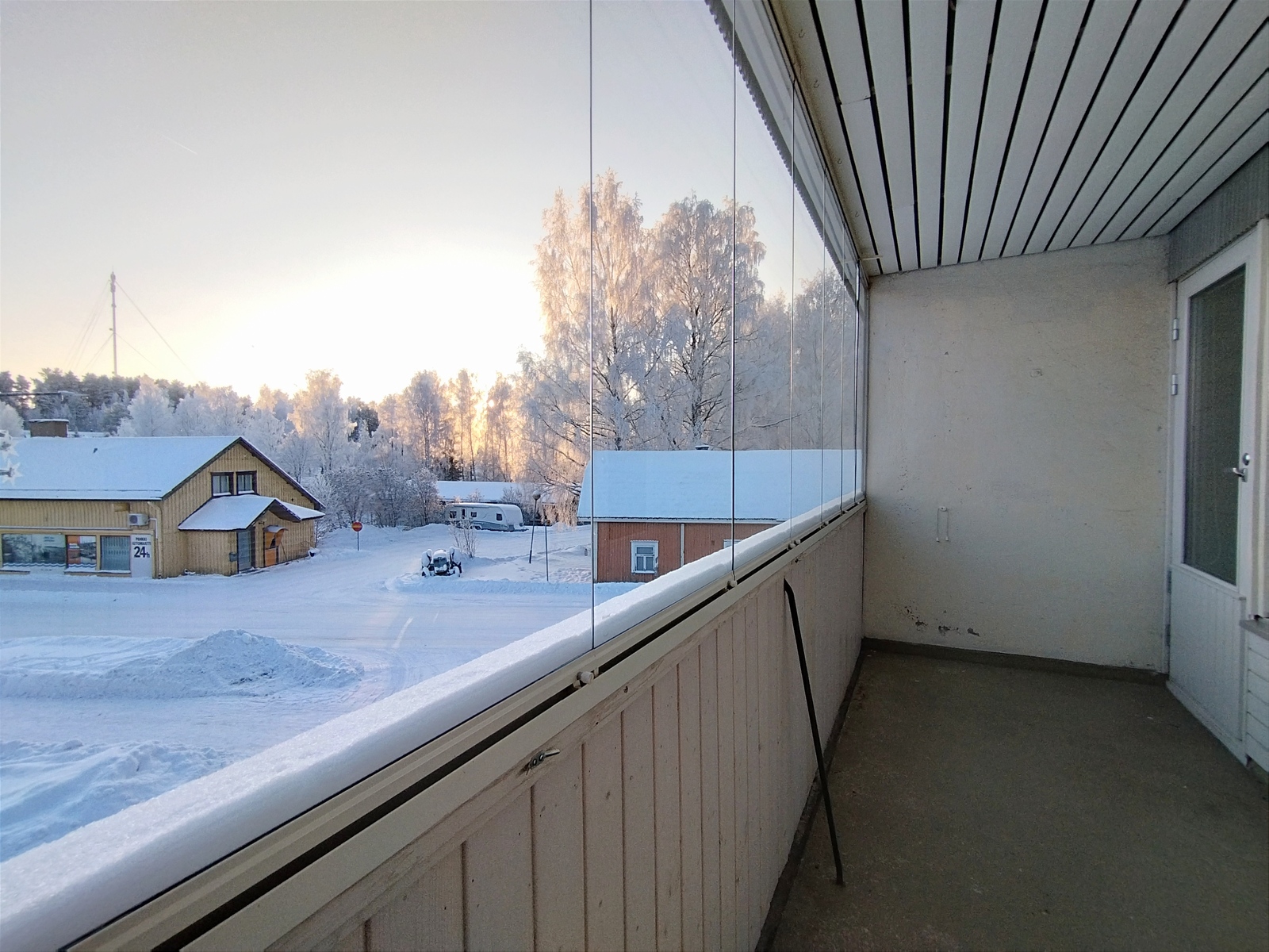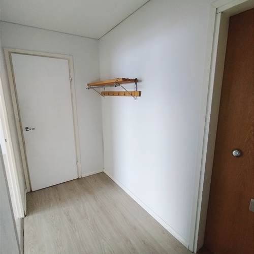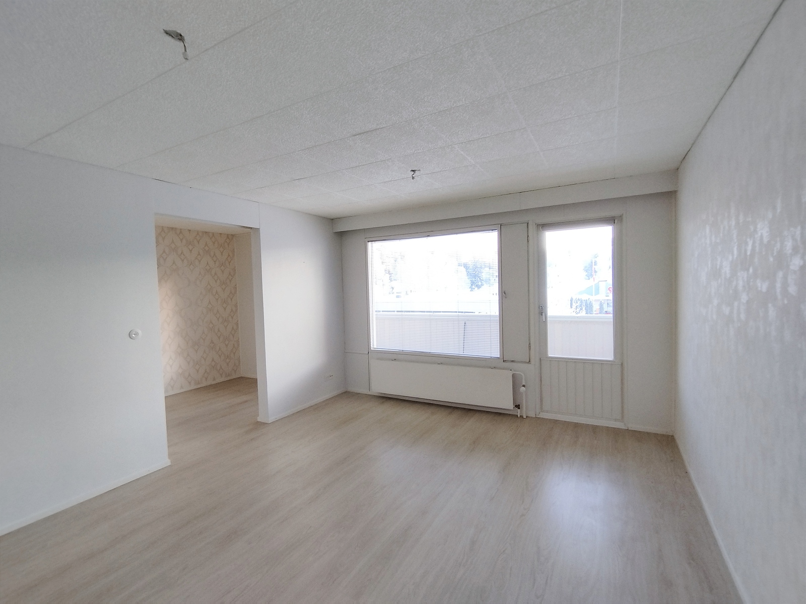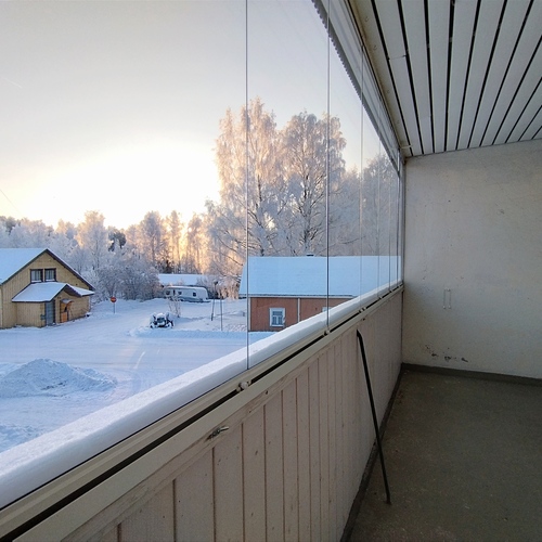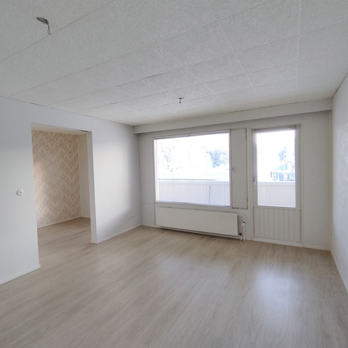 Tilaava valoisa olohuone, josta on käynti lasitetulle parvekkeelle.