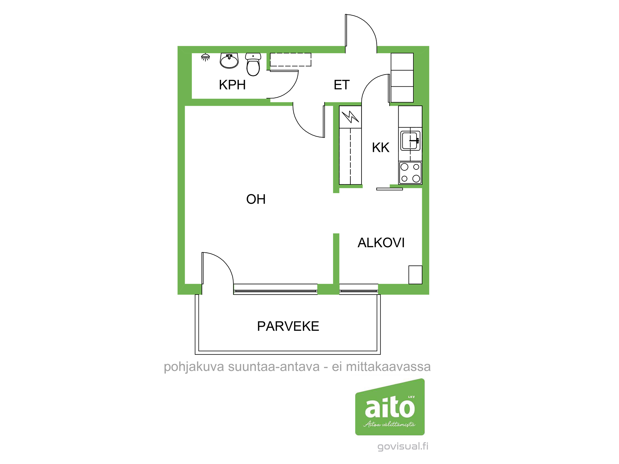 Varusteet: jääkaappipakastin, sähköliesi, liesikupu