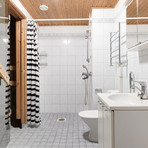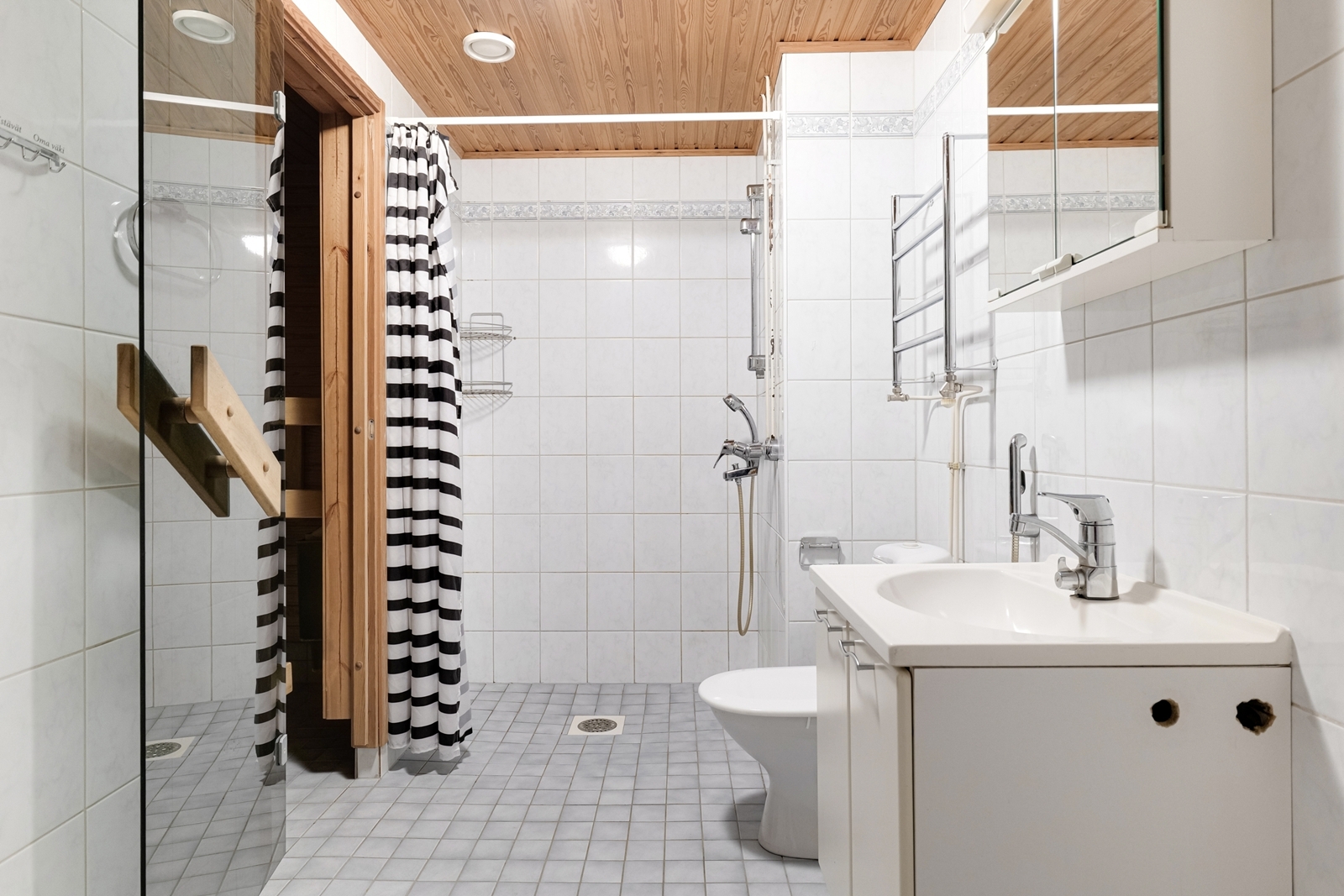 Varusteet: suihku, allaskaappi, peilikaappi, lattialämmitys, kiinteät valaisimet, pesukoneliitäntä
